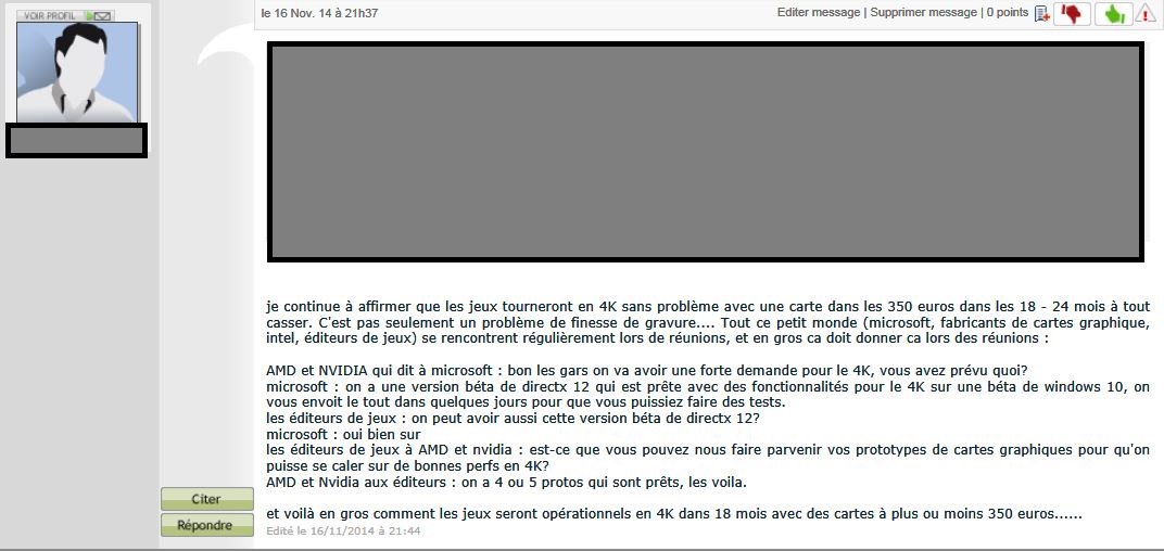 Tiens, ça me rappelle un truc retrouvé en triant un peu sur mon ssd de stockage. Un message posté il y a 11 ans par un ancien membre et qui n’est toujours pas vrai aujourd’hui. Une cg à 350 €, c’est au mieux une RTX 5060 8Gb ou une Radeon RX 7600 8 Gb, les deux me paraissant nettement incapables de faire bien tourner n’importe quel jeu en 4K. On est donc vraiment très loin de son affirmation « dans 18 - 24 mois à tout casser ». ![]()
