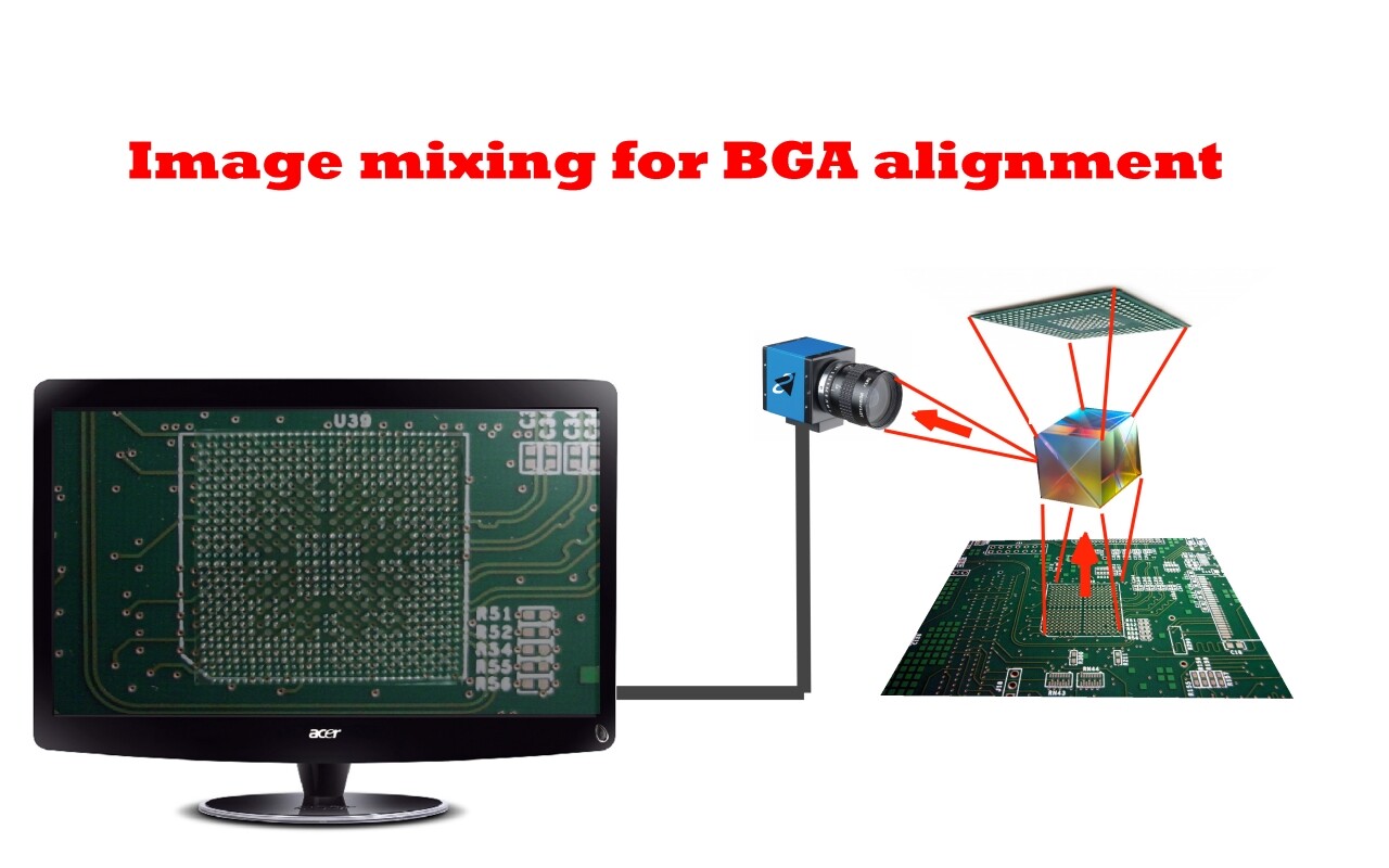 Le but ultime est d’aligner un circuit BGA sur une carte pour le montage. En voici un schéma simplifié (j’ai mis un prisme à titre indicatif):