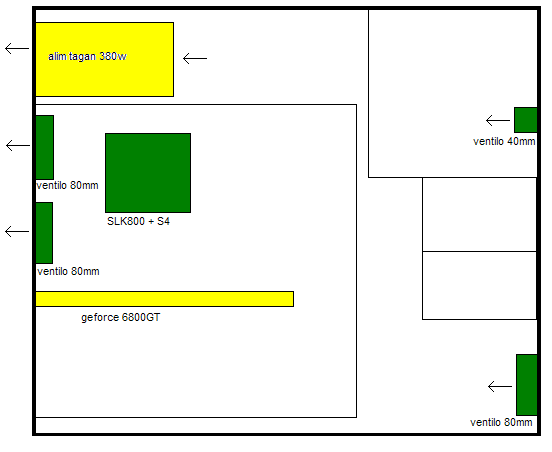 Pour ce qui est du schéma de ma tour, je ne peux pas mettre de 120mm en facade…(pas du tout de place) quand aux ventilo en extraction, il n’y en a que trois car ceux de l’alim etablissent une sorte de « tunnel » qui fait plutot assimiler les deux ventilos de l’alim a un seul mais plus efficace…