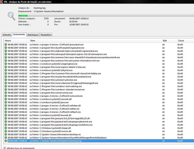 - lors du 1er scan, ça bloquait en me disant que KAV n’avait pas les privilèges d’accès au dossier System Volume Information. J’ai donc remis plus de droit et j’ai vérifié la chose en me promenant dans le dossier et ses sous-dossiers.