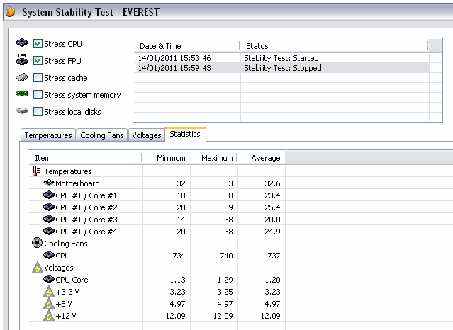 38 a 39° en utilisant intensive avec l’appli de test d’Everest « system stability test »
