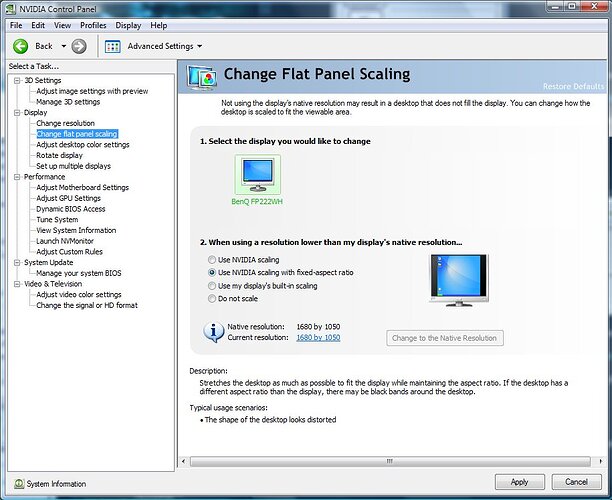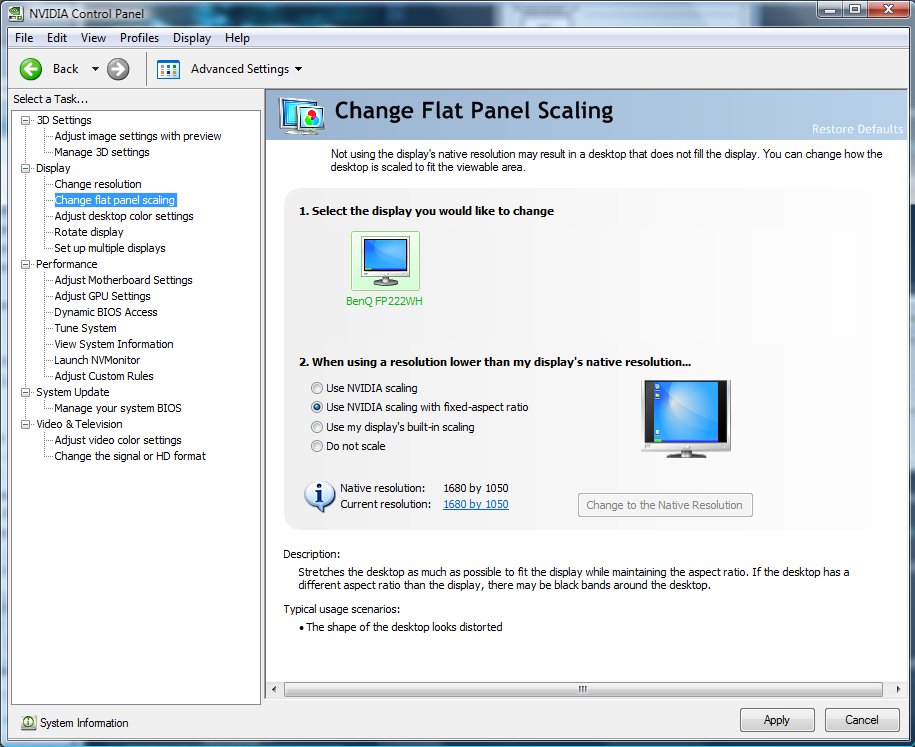 Ensuite, je ne sais pas quoi modifier dans le panneau nVidia, la résolution de l’écran correspond à celle de mon écran (1280x800). Le système s’affiche sans problème SAUF les jeux qui sont ajustés(hélas) quand je les lance.