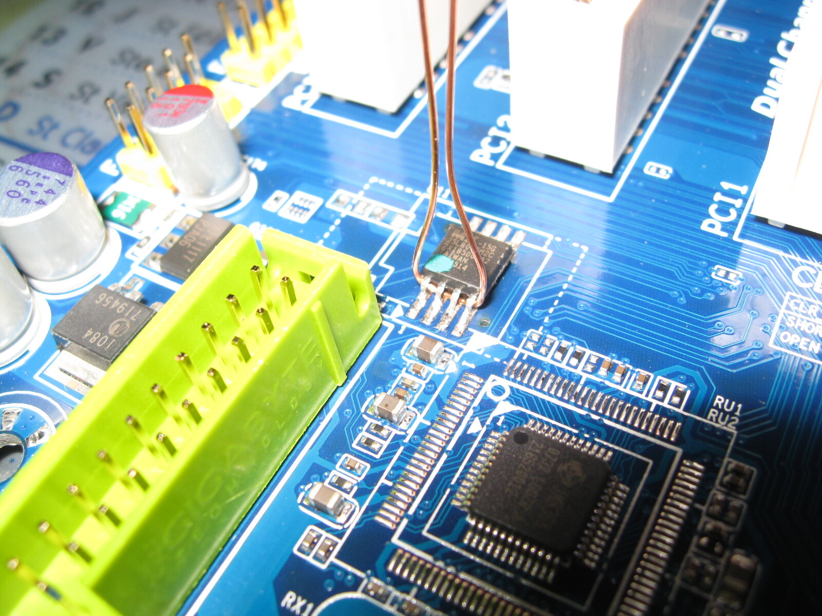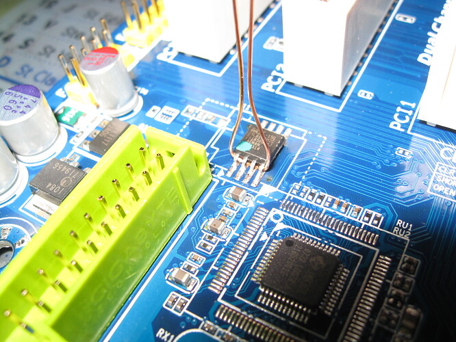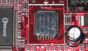 Ici une puce Macronix MX25L8005 qui peut se remplacer par une SST SST25VF080B sur une Gigabyte P35-DS3L. Ce type de puce mesure un demi centimètre et est utilisé sur la plupart des Gigabyte et ASUS actuelles, mais aussi sur des DFI et sûrement d’autres.