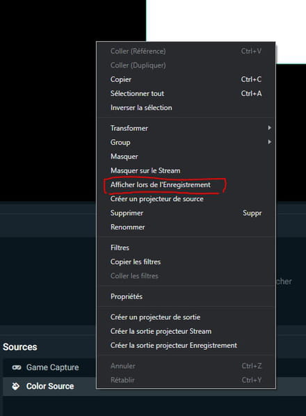 Alors, ce que j’aimerais, c’est cacher les éléments d’une scène pour l’enregistrement. Il y a bien « Masquer lors de l’enregistrement » mais ça ne marche pas, quand j’enregistre, que je récupère le fichier .mp4 il y a toujours les éléments que j’ai pourtant masqué, et quand je le met dans mon logiciel de montage (Premier Pro), il n’y a rien qui change.