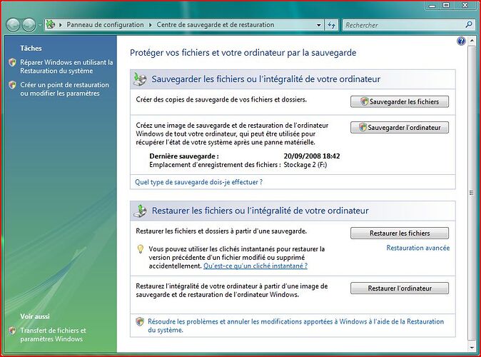 J’ouvre donc le Centre de sauvegarde et de récupération de Vista pour n’utiliser que ma sauvegarde des deux systèmes en même temps.