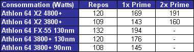 Pitrouille, merci pour le site, bien pratique. Cependant, si je suis laconsommation qu’il me donne, il faudrait que je me tourne vers un x2 3800+, ou un x2 4400+ MV 2200mhz 1.35v (89w) (pour un total de 363 w avec ce dernier). Avec les autres x2, je suis a plus de 400w consommés.