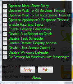 il me sert beaucoup mais le problème c’est qu’il marche uniquement pour windows seven, je cherche le meme outil du genre mais pour windows xp et aussi windows vista, en connaissez vous ? Pas des usines à gaz ^^, juste ce qui faut, c’est vraiment pour reduire le temps de chargement de windows, le temps d’arret, etc… toutes ces petites choses qui m’éviteront d’aller à chaque fois dans la base de registre.