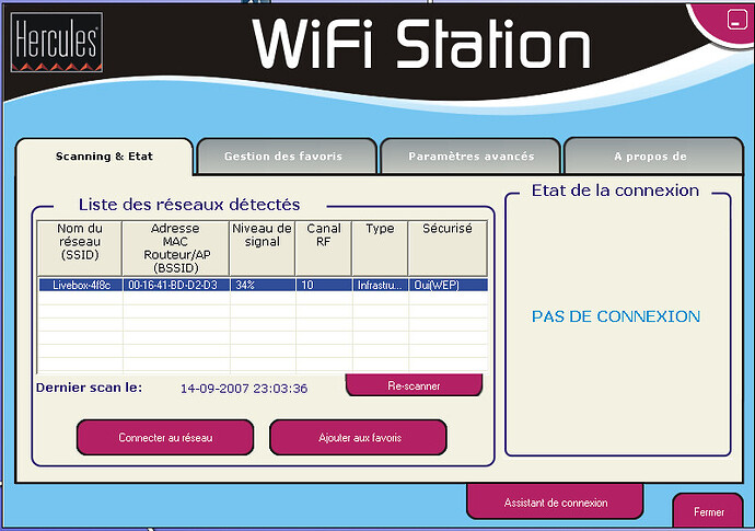 Voilà j’ai un ordi connecté a la livebox par un cable ethernet. Sur cet ordi aucun problème tout fonctionne nickel. Mais j’aimerais connecté mon second PC (qui est à un étage en dessous de la Livebox) par WIFI pour ainsi avoir Internet sur celui du bas. J’ai donc acheté une clé WIFI la « Hercules HWGUSB2-54 ». J’installe les drivers il me dit que le périphérique fonctionne correctement. Je lance le programme « WIFI Station » (fourni avec la clé et les drivers), celui-ci reconnait bien le réseau wifi comme ci-dessous: