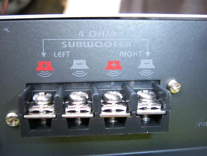 Si c’est 2 enceintes, beh le gauche sur le + et - du canal « left » et le droit pareil du coté « right » … si c’est un subwoofer tout seul tu ponte … c’est indiqué dessus de plus , le + et le - du sub aux extémités …