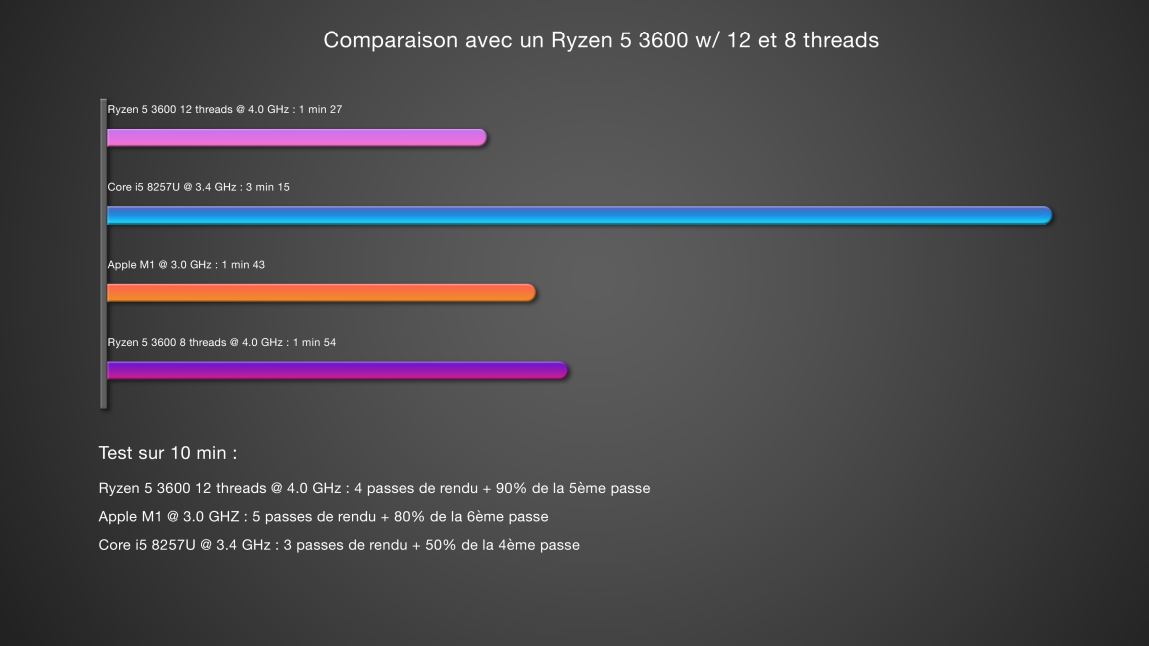 Le Ryzen 3600 est un modèle desktop associé à 32 Go de DDR4. je l’ai testé sur 12 et sur 8 threads histoire d’avoir une comparaison efficace puisque les deux Apple sont sur 8 threads.