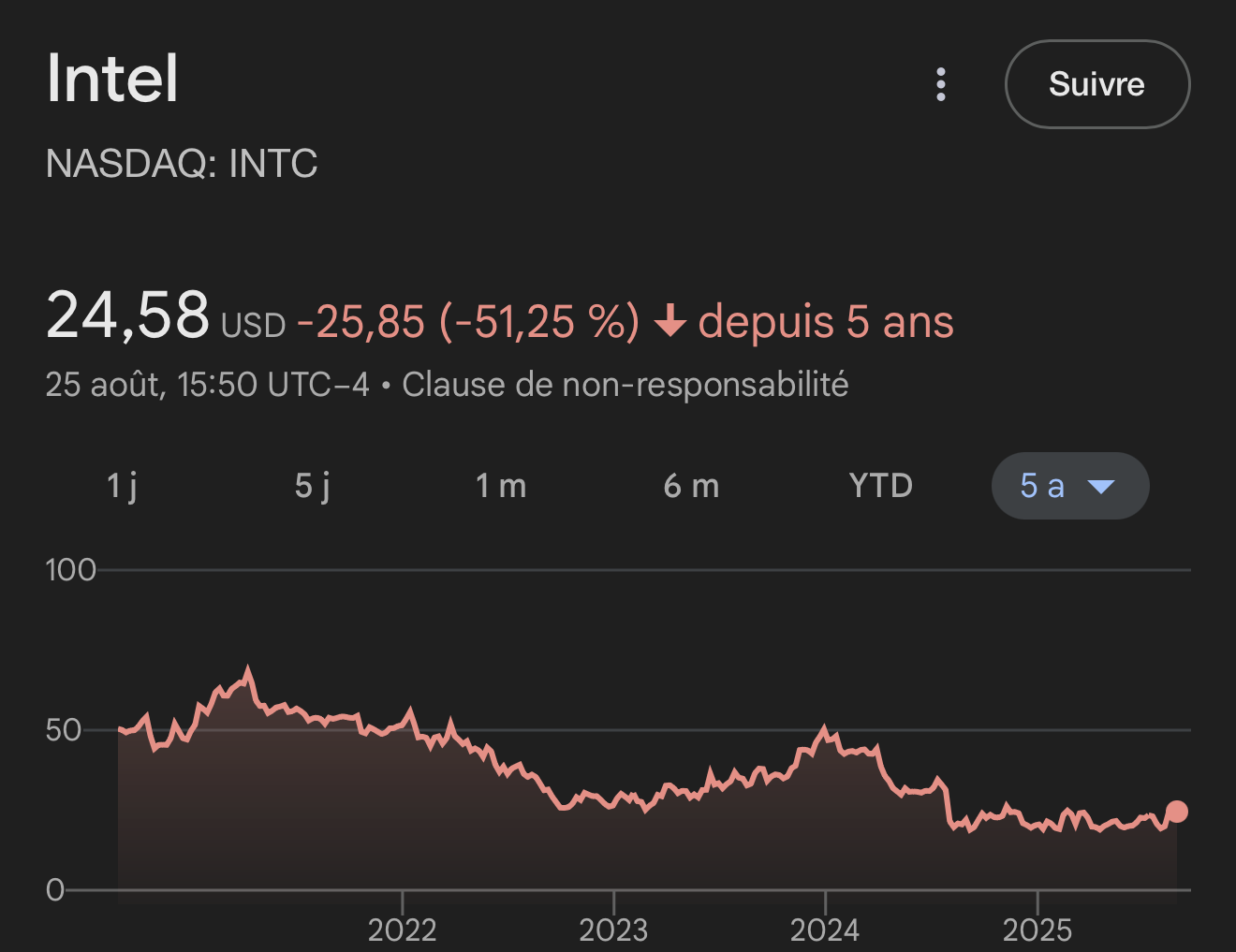 L’État va donc se goinfrer 10% d’Intel pour 6,7 milliards, une participation qui lui aurait couté le double s’ils l’avaient faite par les voies normales. Et qu’ils n’hésiteront pas une seconde à revendre, au prix normal cette fois, si l’entreprise ne donne pas des signes de rétablissement suffisant.