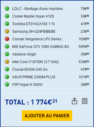 - TopAchat pratique des prix environ 1 tiers plus chers qu’ailleurs, donc je pourrais largement descendre le coût en cherchant un peu (peut-être pas 1000€ comme j’ai dit, mais 1200€ facile);