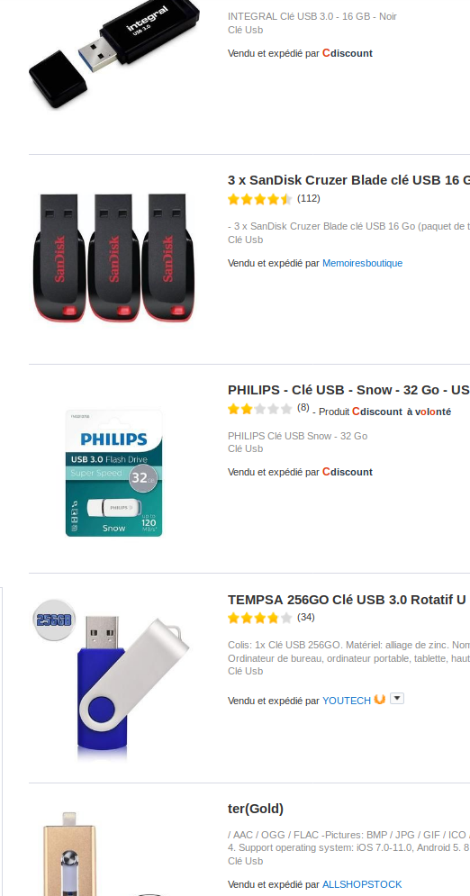 J’ai fait une recherche pour des clés USB. J’arrive sur une liste de produits.