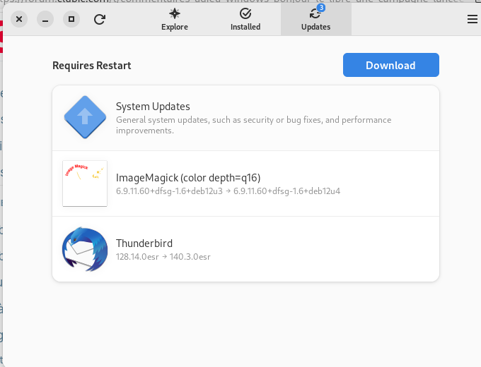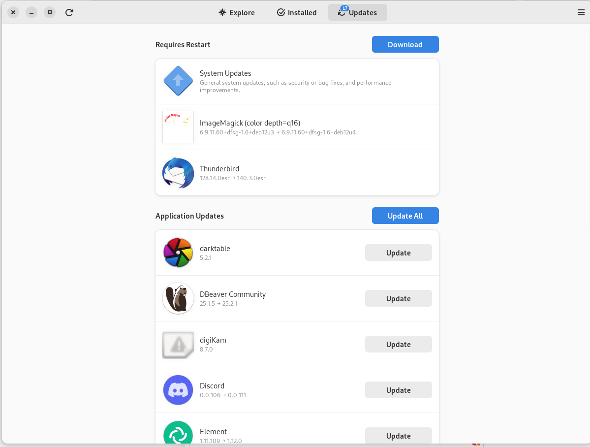Par exemple, sous Debian, Ubuntu, Arch (peu importe la distribution), … avec le bureau Gnome, on peut utiliser l’outil Gnome Software qui permet à la fois :