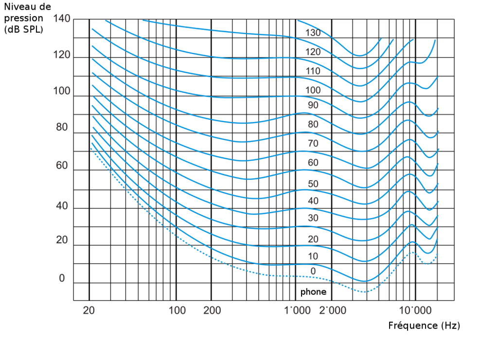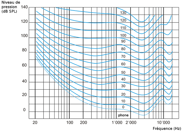 La courbe de mesure au micro droite ne donne pas un rendu « droit et neutre » à l’oreille, car ton oreille n’entend pas le son avec la même sensibilité à toutes les fréquences.