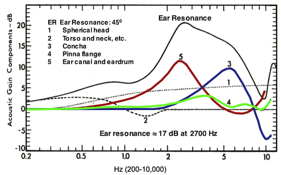 Our reference for the ideal headphone frequency response is the loudspeaker. For loudspeakers, it is widely accepted that the ideal response is a flat frequency response measured with a measurement microphone, on-axis, in an anechoic environment. However, headphones, due to their design, can’t be measured with a measurement microphone and therefore a dummy head must be used. Also, the microphone inside dummy heads have a similar response to the human eardrum, which is quite different from a measurement microphone. Additionally, the shape of the pinna (the outer ear) and the ear canal add resonances to the response of a dummy head above 1kHz, making its response even more different than that of a measurement microphone.
