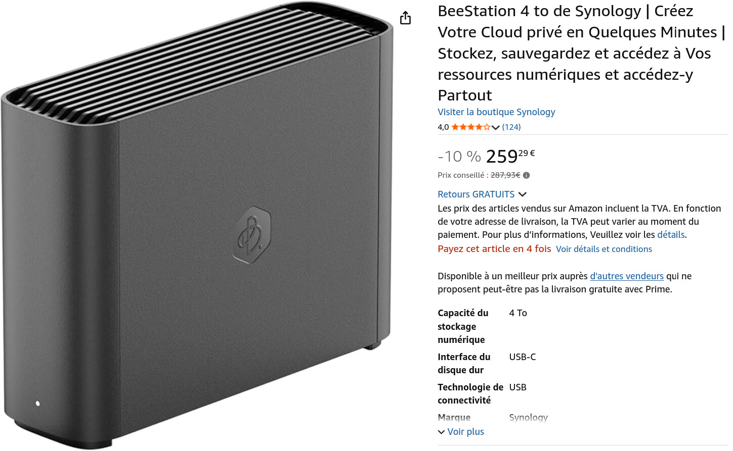 Par exemple, si je veux 4 to de stockage « cloud », je peux acheter le bee station à 260€ prêt à l’emploi + un HDD à 130€ pour faire une sauvegarde mensuelle = 390 €.