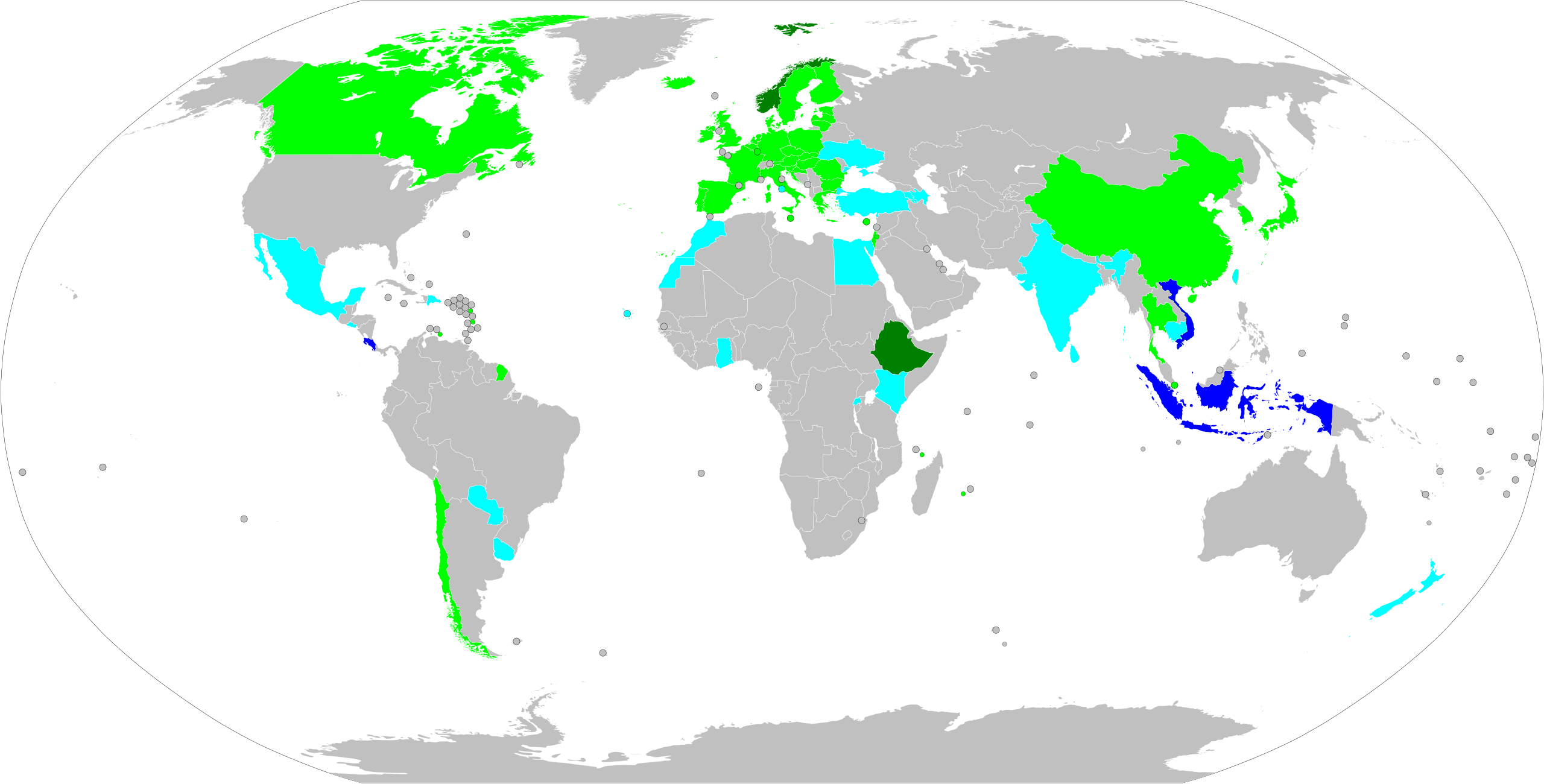 En vert et bleu, tous les pays qui se sont déjà engagés sur une élimination progressive des véhicules thermiques :
