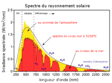 "Le rayonnement solaire est aussi responsable des climats et de la plupart des phénomènes météorologiques observés sur la Terre. En effet, le bilan radiatif global de la Terre est tel que la densité thermique à la surface de la Terre est en moyenne à 99,97 % ou 99,98 % d’origine solairenote 1. Comme pour tous les autres corps, ces flux thermiques sont continuellement émis dans l’espace, sous forme de rayonnement thermique infrarouge ; la Terre restant ainsi en « équilibre dynamique ». "