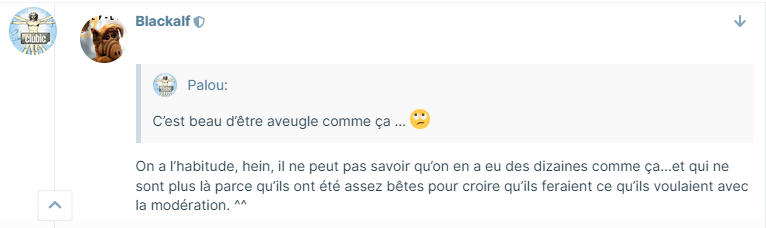 On a l’habitude, il y en a toujours qui croient pouvoir se comporter ici comme ils l’entendent et défier la modération. Ca ne dure jamais longtemps. ![]()
