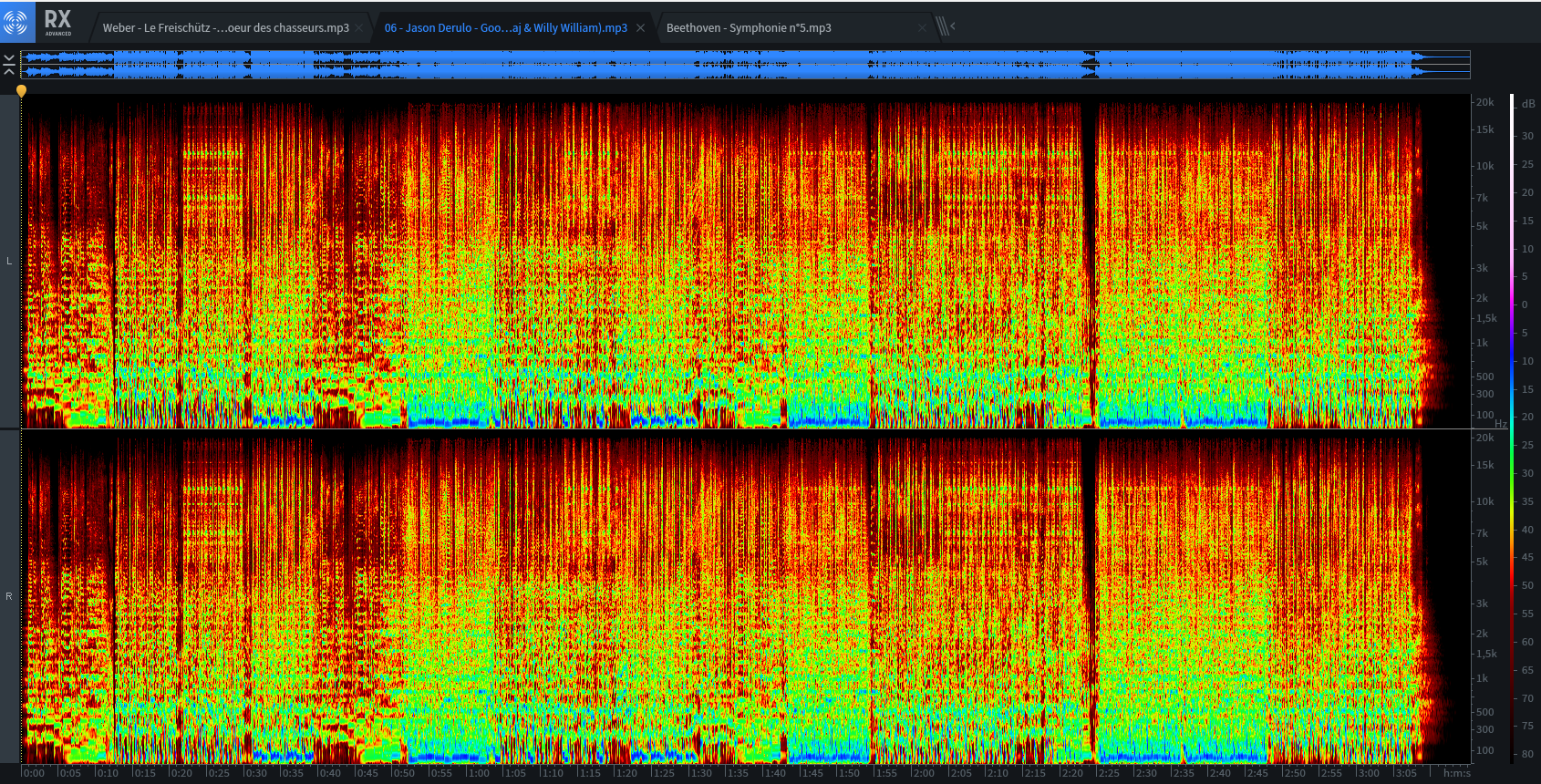 Beethoven - Symphonie n°5 je suis presque a -80db en dessus de 15kz, donc meme si il y a du signal c’est 70db de moins que les 100hz ce qui est énorme comme écart. (exemple 96 db c’est faire du marteau piqueur dans une pièce sans protection et être en même temps capable d’entendre voler une mouche dans la même pièce)