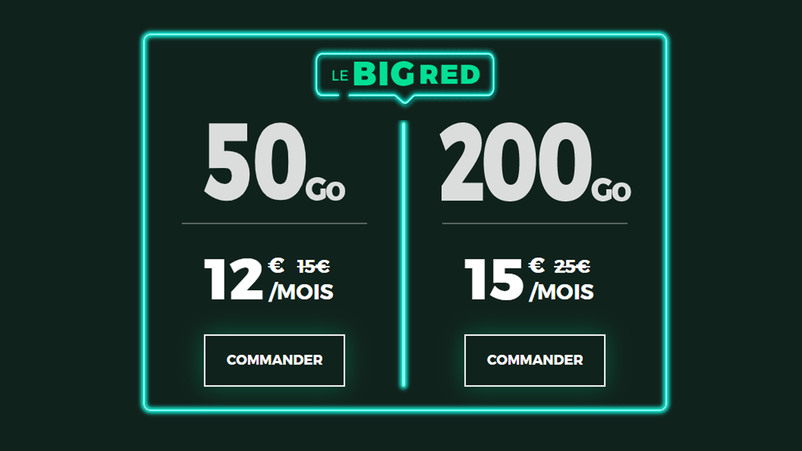 Si vous recherchez un forfait mobile à petit prix et sans engagement tout en bénéficiant d’un forfait Internet conséquent, vous devriez regarder les deux offres proposées en vente flash jusqu’à la fin de l’après-midi par Red by SFR. Le forfait 50 Go est à seulement 12 € par mois et le 200 Go est à 15 € par mois.