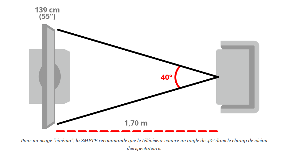 THX recommande un écran qui offre un angle de vision de 36° aux spectateurs du dernier rang. Avec cette config on obtient un angle de vision env 40° dans les rangées du second tiers.