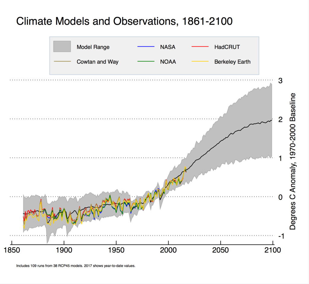 Et pour l’instant les mesures (différentes lignes en couleur, mesurées par différentes agences) suivent bien la moyenne (ligne noire) des prédictions (zone grise) hélas :