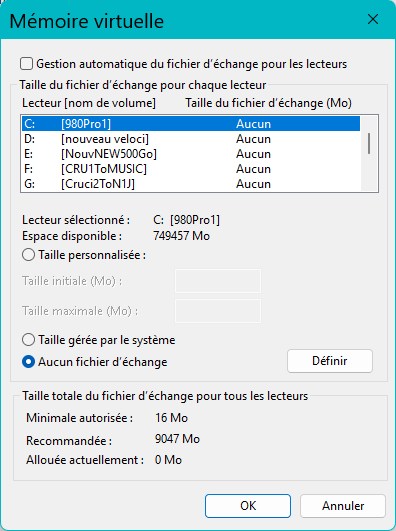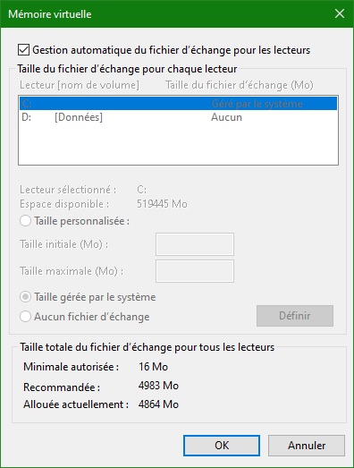 En lisant la discussion, je me suis posé la question du cache de Windows : ayant 64Go de RAM, je n’ai pas besoin de cache. Du coup j’ai été voir où en était mon réglage : remis par défaut !