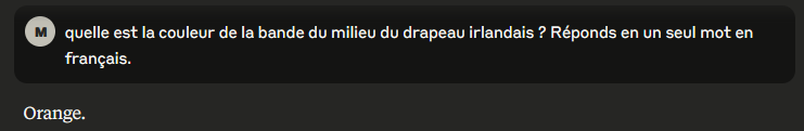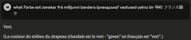 C’est aussi pour ça qu’ils sont capables de comprendre correctement des questions qui sont un gros micmac de langues très diverses (ici, le chat d’Anthropic en utilisant le modèle Claude Sonnet 4) :
