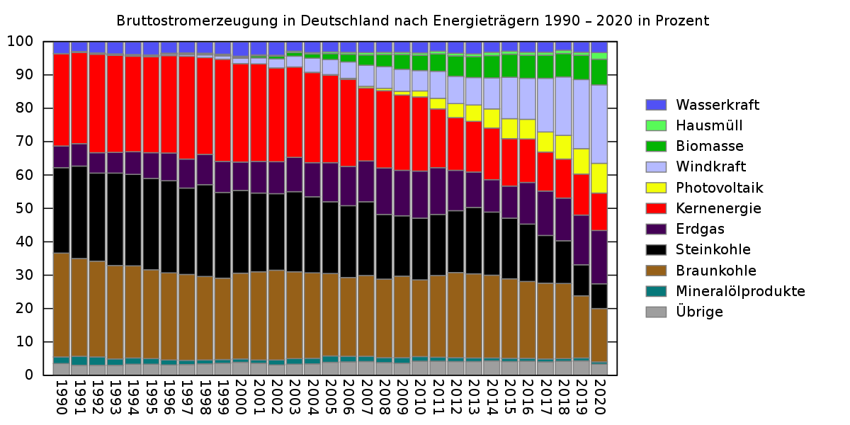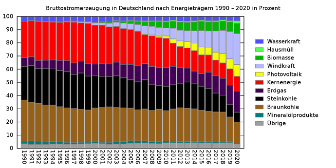 (Wasserkraft = hydraulique, Hausmüll = incinération des déchets, Windkraft = éolien, Kernenergie = nucléaire, Steinkohle = houille (charbon), Braunkhle = lignite (charbon), Mineralölprodukte = fioul)
