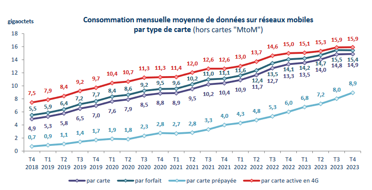 Sinon, de manière plus générale, mais sans le détail des usages, l’observatoire de l’ARCEP mentionne une moyenne de 15.7 Go par abonné en France au 4ème trimestre 2023 :