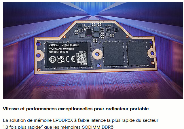 Sinon, tu peux aussi aller voir sur le site de Crucial ou celui de Lenovo. Ils disent tous les deux que leur mémoire LPCAMM2 est de la LPDDR5X (Lenovo met même en avant en priorité le fait que c’est de la LPDDR5X) :
