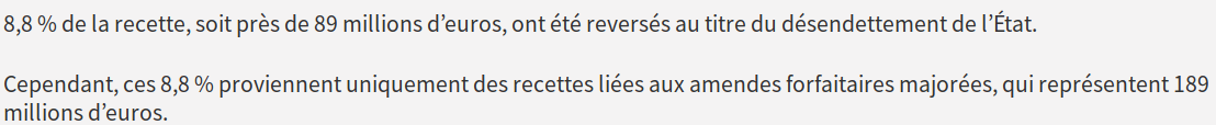 8.8% de toutes les amendes sont investis dans le désendettement, ce qui représente 20.9% des amendes collectées uniquement grace aux radars auto (j’ai pas fait le calcul mais ça semble vouloir dire que les 8.8% de désendettement ne viennent que des radars auto et pas des contrôles de police).
