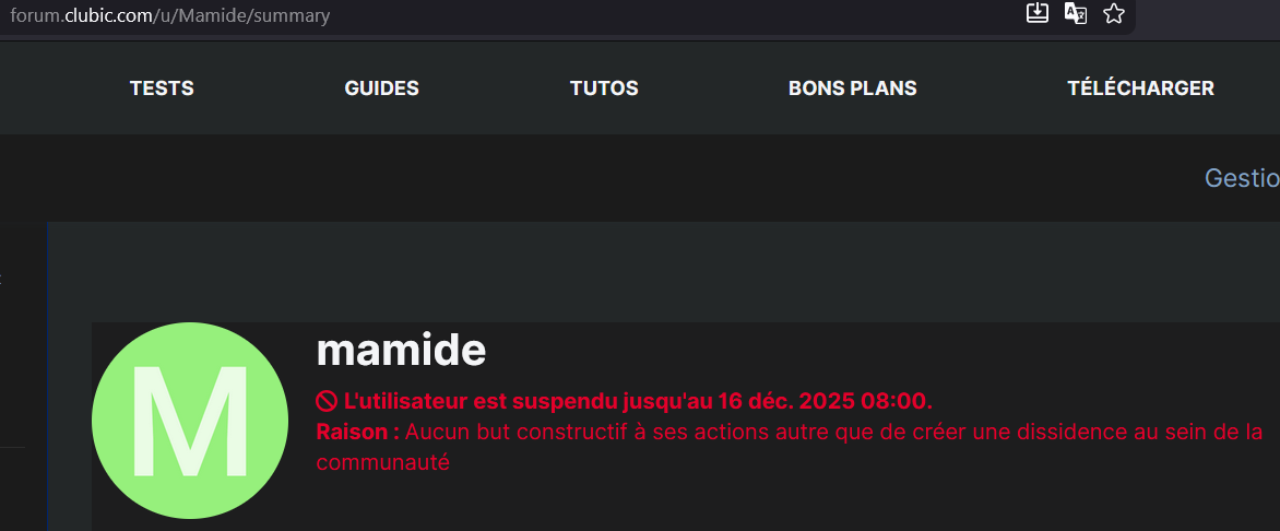 Maintenant que tu m’a donné le nom complet, j’ai trouvé ce fameux mamide et c’est pas cool La désinformation, déjà il n’est pas banni pour pédophilie, et deux il n’est pas banni du tout, il est juste suspendu
