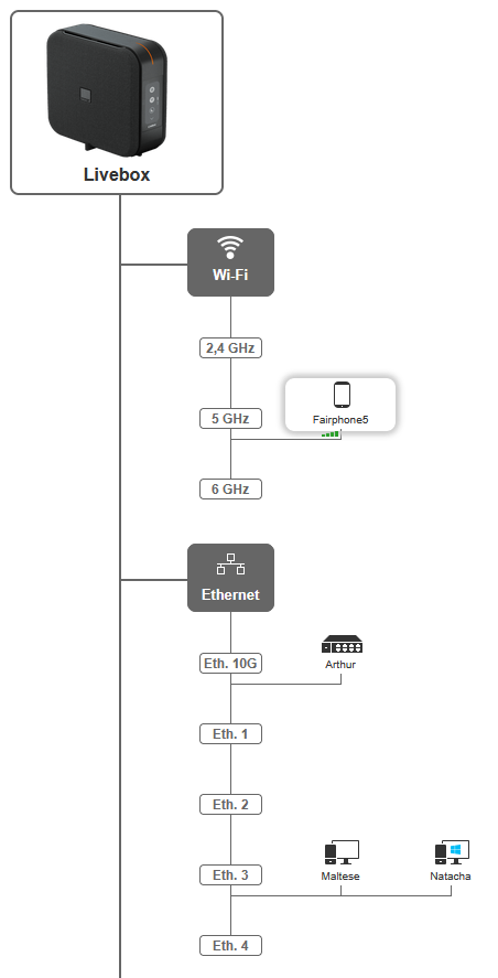 Ce n’est en tout cas pas ce que je constate chez moi, j’ai derrière ma Livebox un switch et un routeur, le Wi-Fi reste bien activé, et sur la « carte » du réseau, l’interface de ma Livebox affiche bien les deux machines qui sont derrière le switch (Maltese et Natacha sur le port 3) :