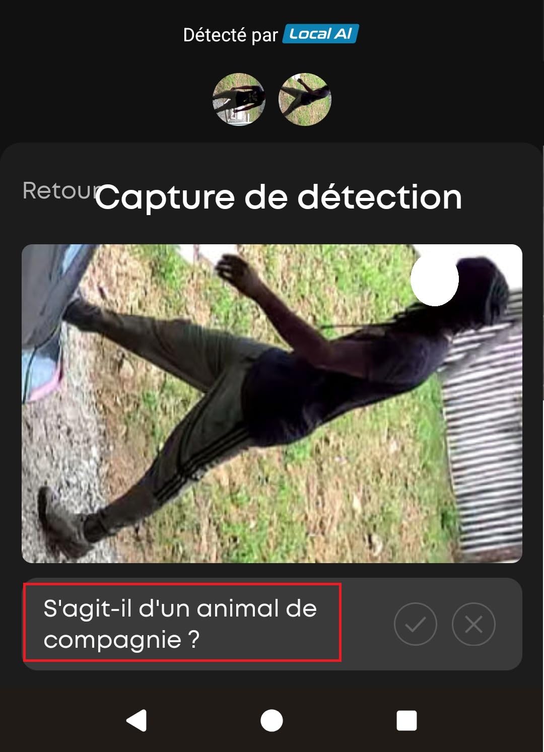 - sur l’IA, on peut juste confirmer la détecter sur l’application, exemple il va dire « est-ce une personne » au lieu de détecter le voisin, on pourra juste le confirmer, si on dit le contraire il nous demandera ce qui a été mal détecté sans jamais nous laisser le choix de dire qu’il s’agit du voisin.