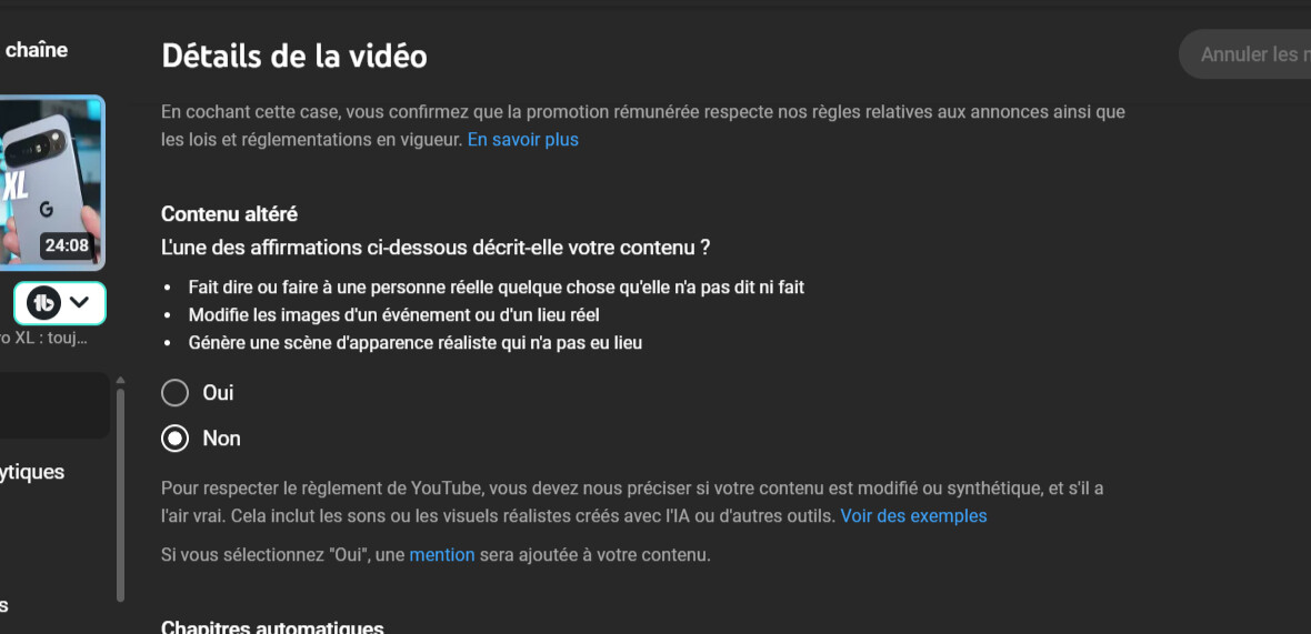 Tout le problème sur YouTube, c’est que ces vidéos sont… entièrement autorisées. Quand tu importes une vidéo depuis les paramètres YouTube, YT te demande si ton contenu a été altéré ou pas par de l’IA.