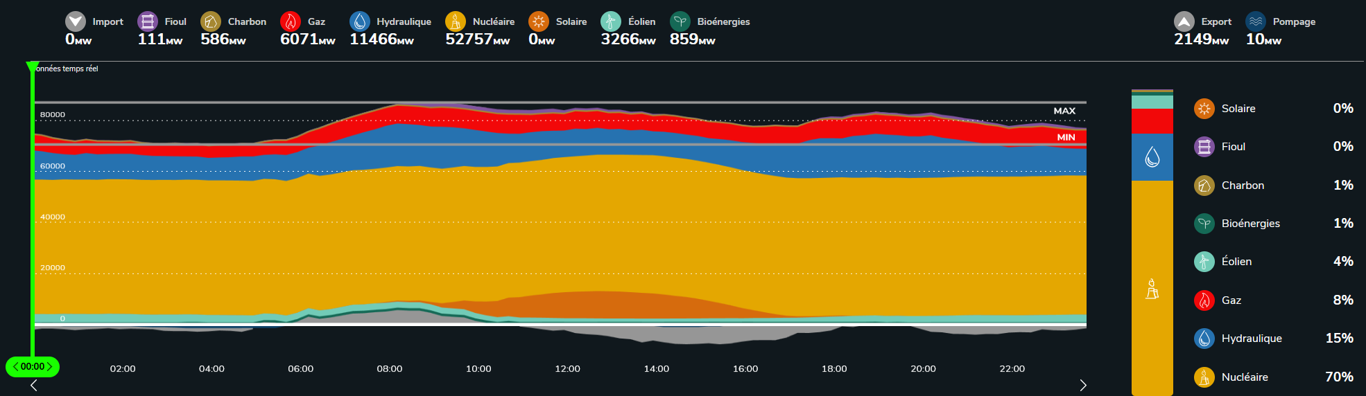 Là sur cet exemple, ça va parce qu’il y a de la demande à l’export, mais c’est pas forcément toujours le cas, parfois il faut baisser fortement la production nucléaire en journée (il n’est pas rare de voir des variation de plus de 10GW entre le min et le max du nucléaire sur la journée), ce qui est coûteux, car ces variations accélèrent l’usure de certains éléments et augmentent le poids des coûts fixe par kWh produit.
