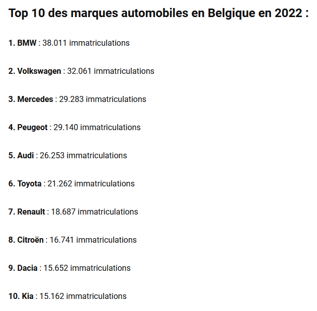Bref, proportionnellement à la population, nous achetons bien plus de véhicules neufs et sans trop regarder au prix. Il suffit de regarder le top 5 des ventes en 2022 (et pour Peugeot, la majorité des modèles que je vois sur les routes ne sont pas les moins chers) :