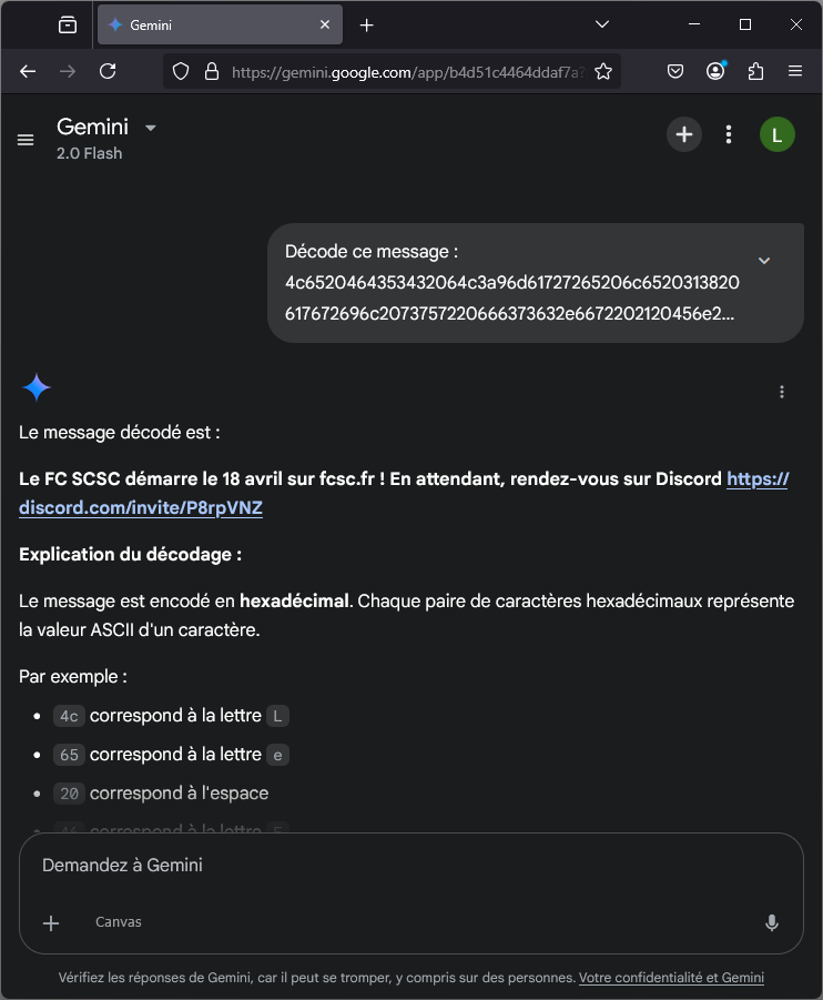 Le décodage par Grok : « Le FCSC démarre le 18 avril sur http://fcsc.fr ! En attendant, rejoignez-nous sur Discord »