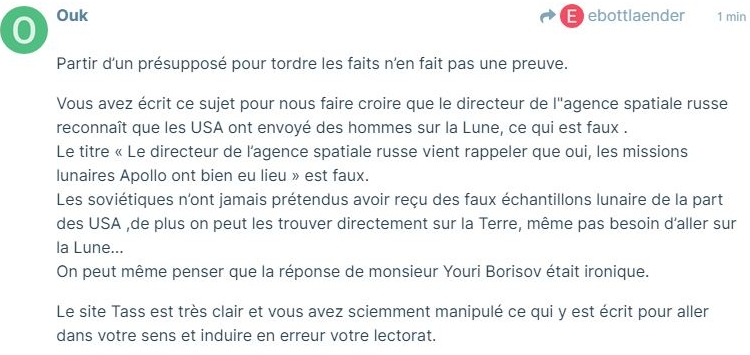 Depuis le début je parle de la falsification d’un sujet qui est la présence d’homme sur la Lune où un « contributeur » prétend effrontément qu’un ruZZe à fournit une preuve.