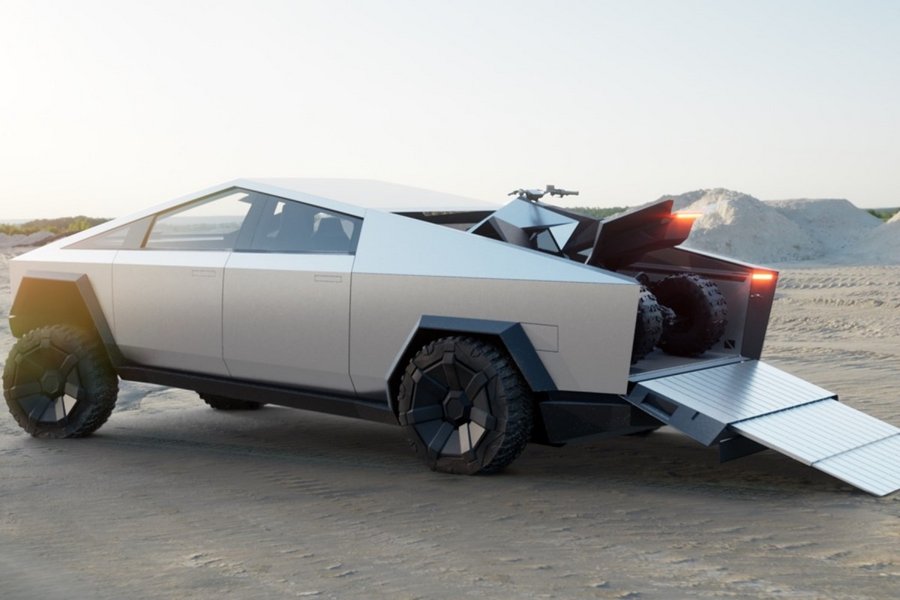 Le quad électrique de Tesla est le pendant du Cybertruck, son gabarit est prévu pour rentrer dans la benne du pick-up dont il reprend le look en étant recouvert du même style d’acier.