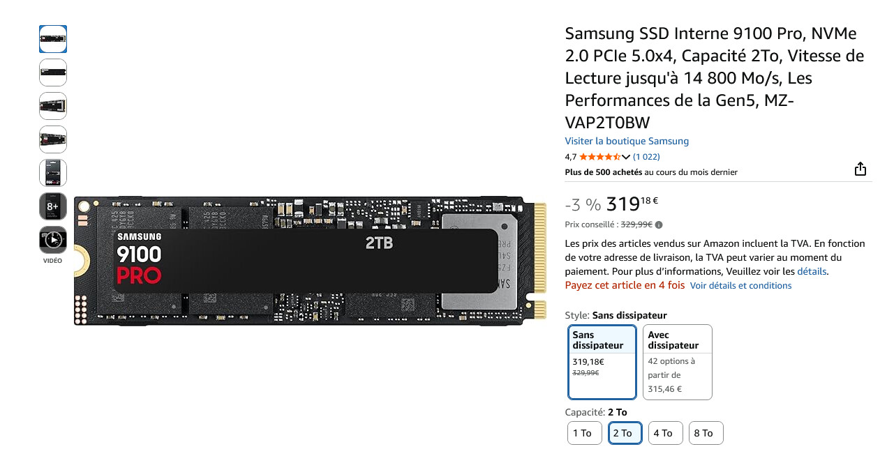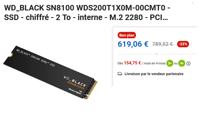 Western Digital Black SN8100 2 To tu le trouves à 375 euros. C’est cher certes mais c’est pas les 619 que tu affiches. Le 9100 pro est même trouvable moins cher.