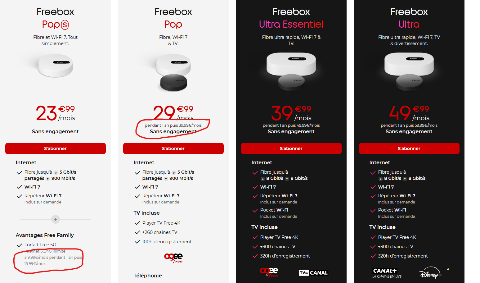 freebox pop s 24€+ 9,99 pendant 1 an après 15€ si abonné free sinon 20€; donc au bout d’un an, je vais devoir changer d’opérateur si je souhaite faire des économies. (red 100go c’est 9€, pour dépasser les 100go si en plus, on a la fibre, c’est difficile)