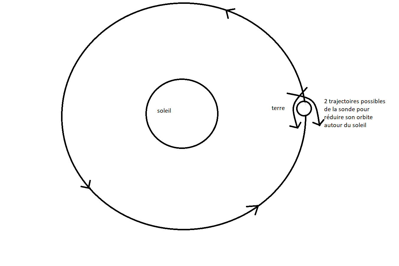 Dans le référentiel du soleil, nous cherchons donc à faire freiner le satellite pour que celui ci baisse son orbite. Comment? en le faisant passer prêt de la terre avec une certaine trajectoire.