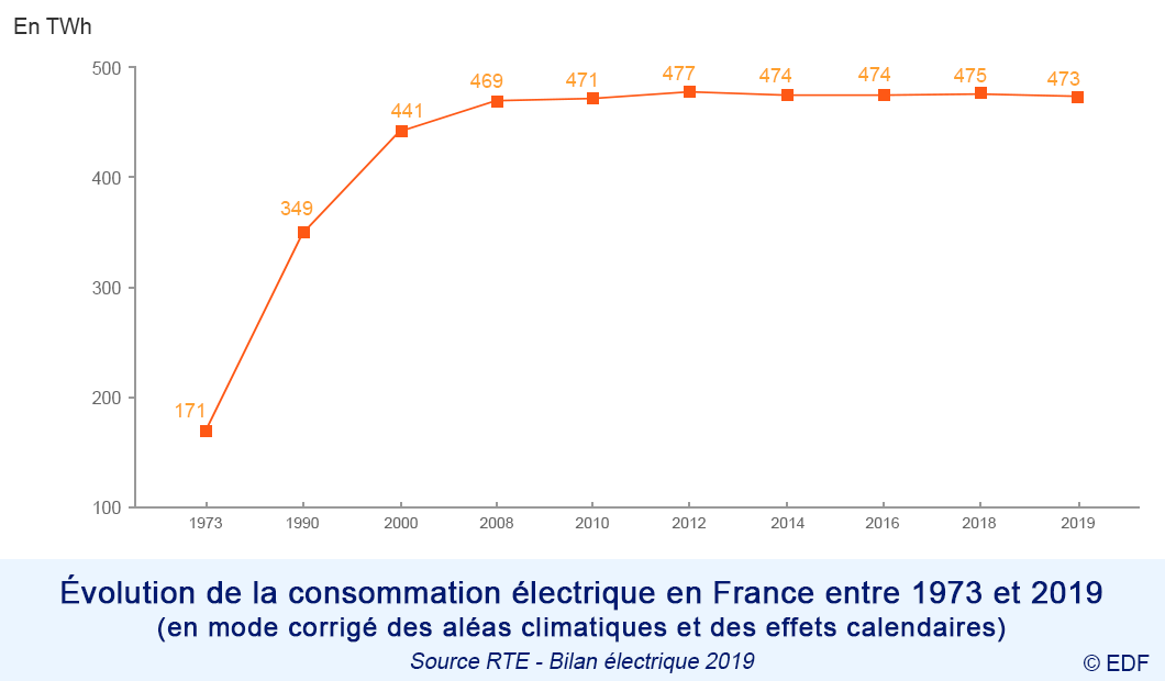 En fait, la dernière augmentation du parc nucléaire, avec la mise en service des 4 réacteurs les plus récents, a eu lieu au tout début des années 2000, donc au moment où la consommation électrique de la France a commencé à se stabiliser.