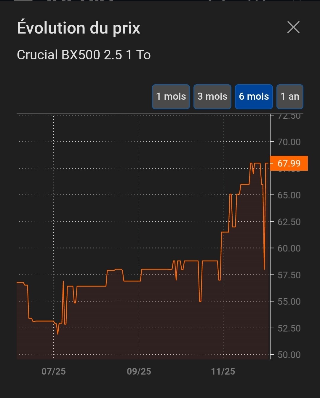 SSD entré de gamme sata le crucial BX 500, le mix est meilleur en gestion du cache. Juste que le SSD a quelques semaines de retard sur l augmentation, mais ça a commencé