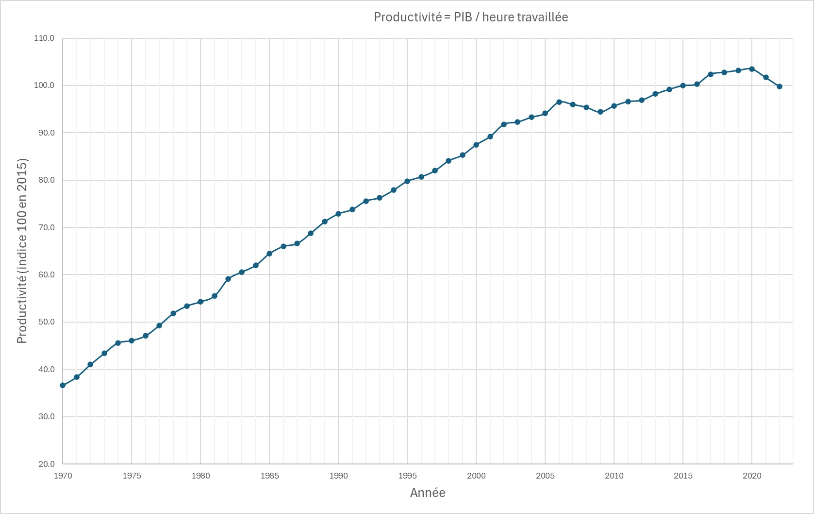 Maintenant, je ne pense pas que ce soit un problème si grave que ça car la productivité en France a bien progressé pendant la période (attention ce n’est pas ajusté en fonction du différentiel d’inflation dollar/euro) :
