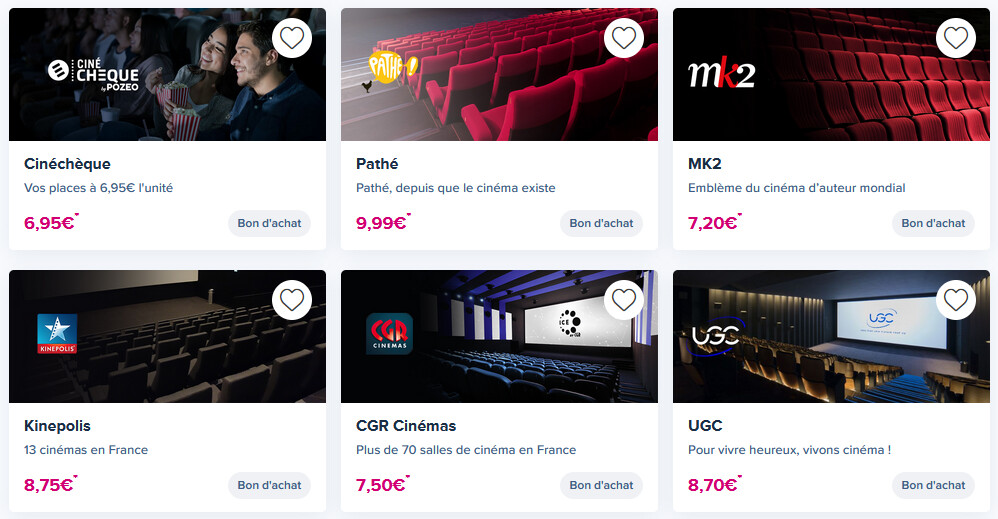 Tiens par exemple avec ma banque, j’ai des places pour toutes les grandes chaînes entre 7 et 10€ :